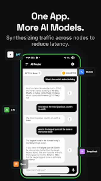 AI Router - Multi AI Assistant, farklı AI modellerini tek bir uygulama altında birleştiren pratik bir araçtır. Kullanıcılar, iş, eğitim, yazma ve günlük yaşam gibi çeşitli alanlarda ihtiyaç duydukları desteği almak için bu uygulamayı kullanabilirler. Uygulama, kullanıcıların farklı AI sohbet uygulamaları arasında geçiş yapmak zorunda kalmadan, yanıtları karşılaştırmalarına ve en uygun modeli seçmelerine olanak tanır. Kullanıcılar, metin özetleme, çeviri, mesaj iyileştirme ve fikir üretimi gibi görevlerde hızlı yanıtlar alabilirler. Uygulama, sesli giriş desteği ve Markdown uyumlu temiz bir arayüz sunarak sohbet deneyimini daha da kolaylaştırır.
